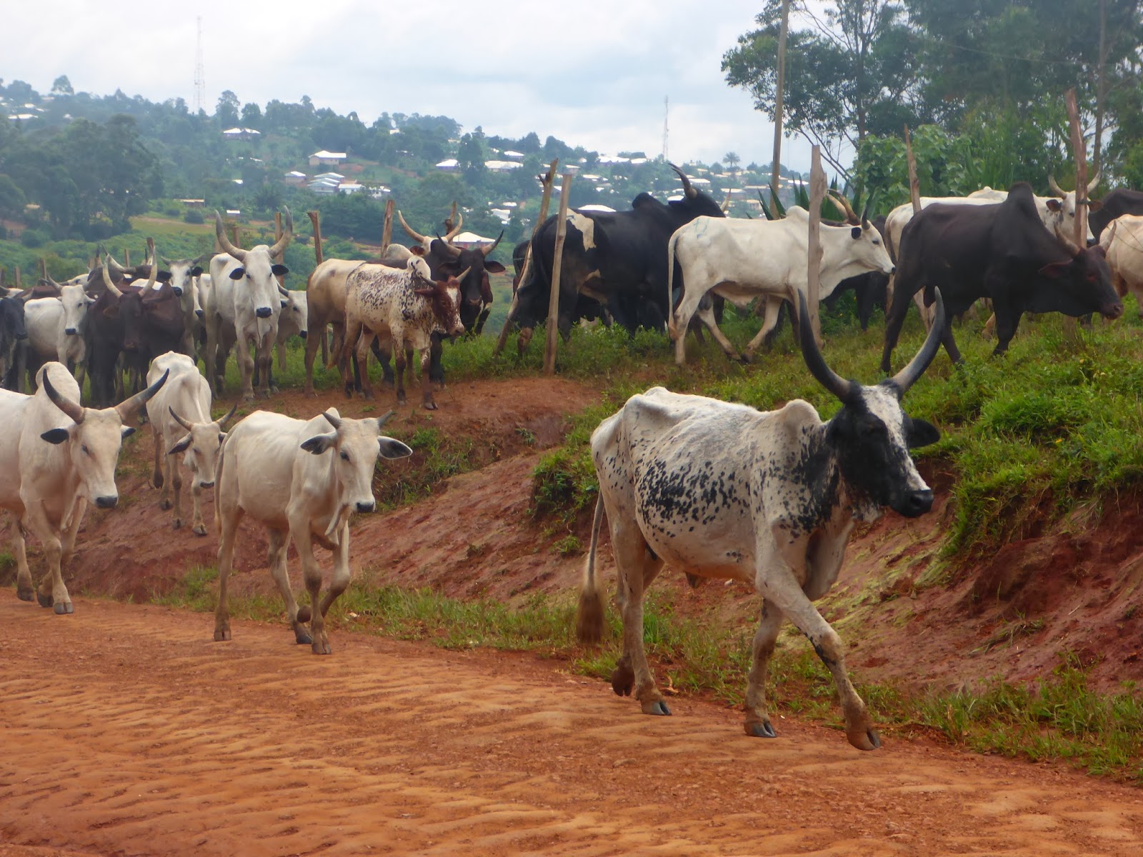 Plötzlich hören wir lautes Gröhlen. Ein Hirte treibt eine Heerde Kühe direkt an uns vorbei. Aus Vorsicht stellen wir uns auf eine kleine Anhöhe, denn wirklich kontrollieren lässt sich die Heerde nicht.